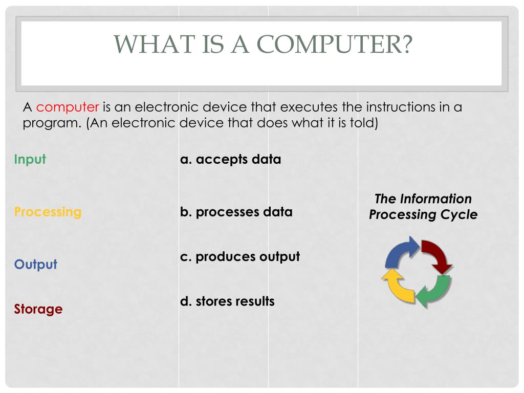 What is a Computer? A computer is an electronic device that executes the instructions in a program. (An electronic device that does what it is told)