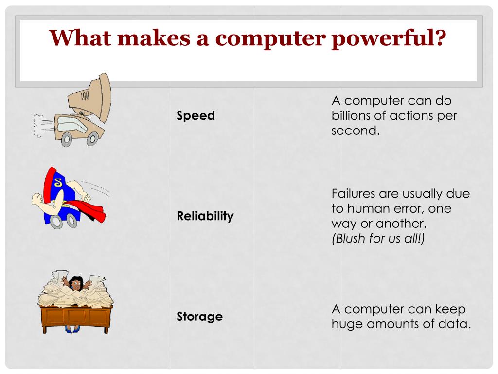 Types of computers • Computers vary in type, size, speed and capability. • PC (personal computer) – The most common type of computer. Found in homes, offices and schools.