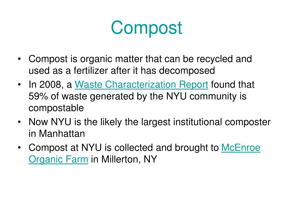 Compost • Compost is organic matter that can be recycled and used as a fertilizer after it has decomposed • In 2008, a Waste Characterization Report found that 59% of waste generated by the NYU community is compostable • Now NYU is the likely the largest institutional composter in Manhattan • Compost at NYU is collected and brought to McEnroe Organic Farm in Millerton, NY