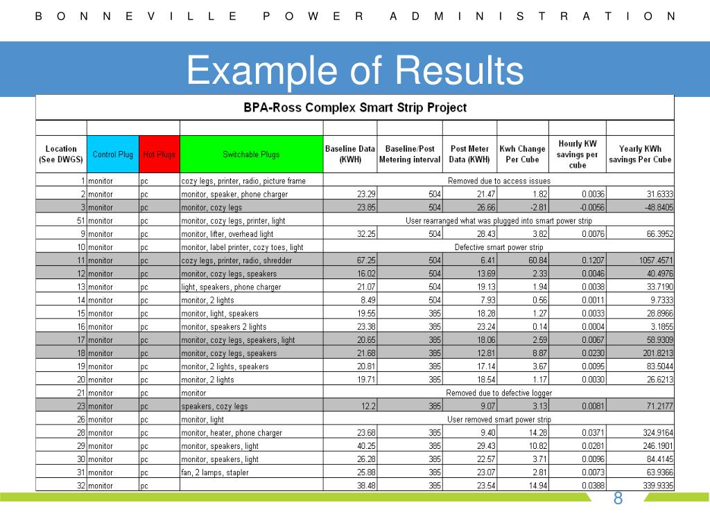 BPA Metering Study • Details about the research activities • A total of 48 smart strips installed • Installed at Ross Complex, Vancouver, WA • Approximately 3 weeks baseline and post metering time during April/May 2011 • Kill-A-Watt Meters used for data collection • ‘Current Sensing’ Smart Power Strip was installed • Load sensor device