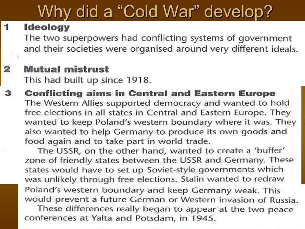 The Cold War. The Cold War. Why did a “Cold War” develop?. 1. Ideology. Marxism: The “Communist Manifesto”. Workers (proletariat) deprived of wealth they create by the bourgeoisie (wealthy) Government is run by bourgeoisie Religion is an opiate for the masses Therefore: