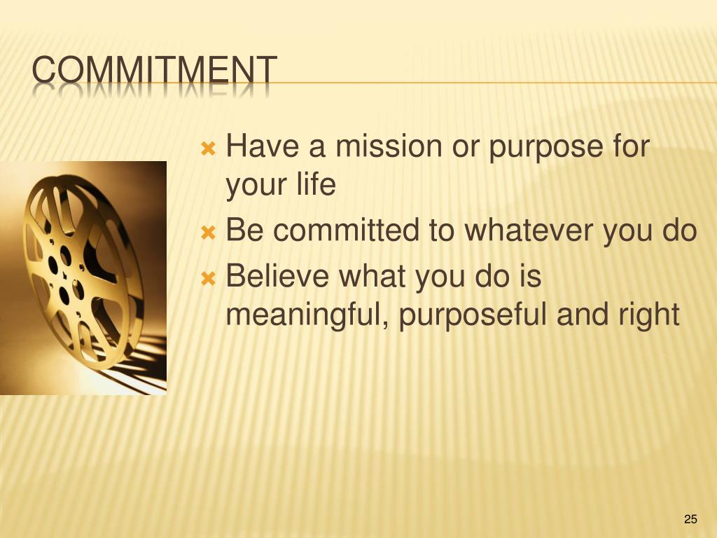 Commitment • Have a mission or purpose for your life • Be committed to whatever you do • Believe what you do is meaningful, purposeful and right