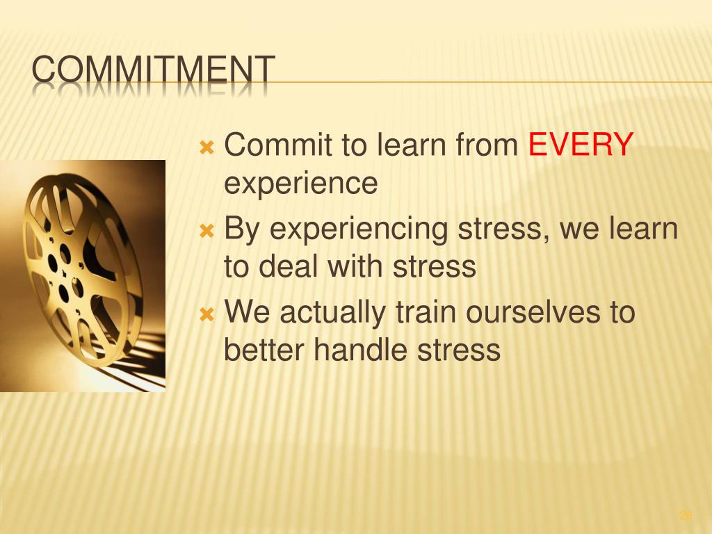 Commitment • Commit to learn from EVERY experience • By experiencing stress, we learn to deal with stress • We actually train ourselves to better handle stress