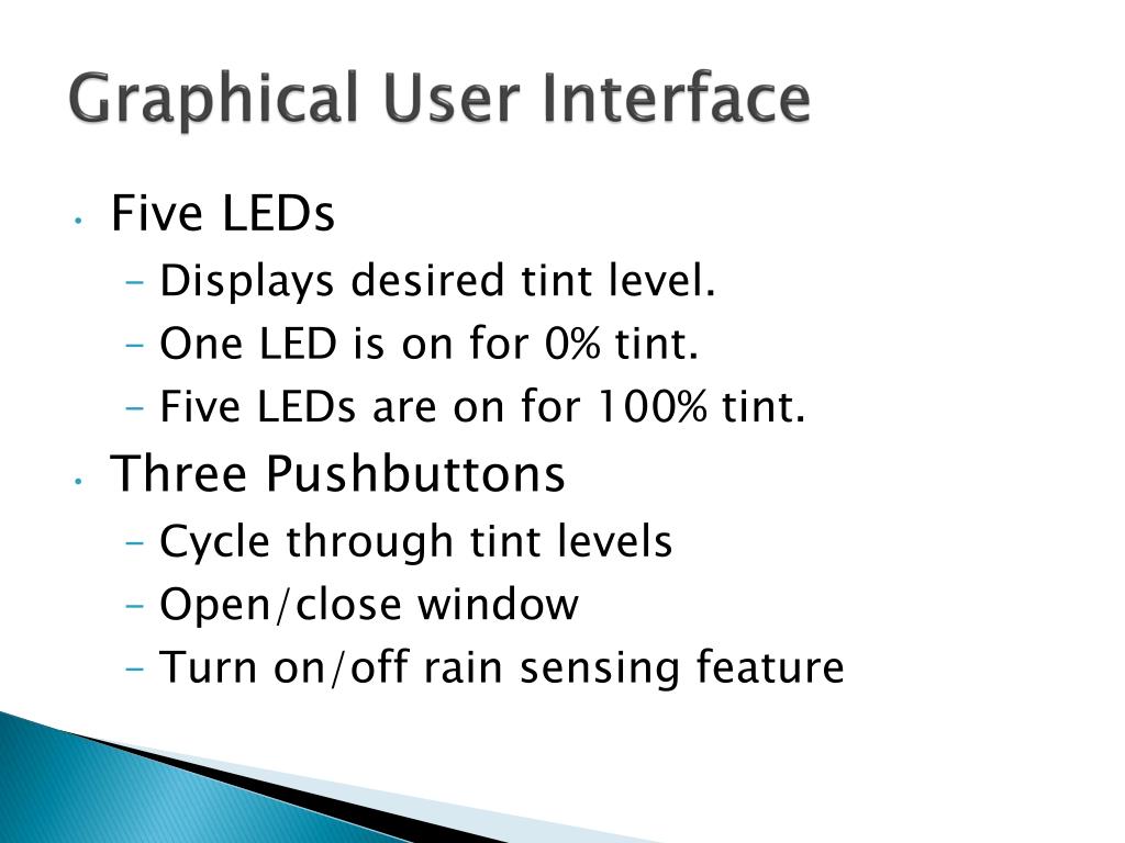 Graphical User Interface • Five LEDs • Displays desired tint level. • One LED is on for 0% tint. • Five LEDs are on for 100% tint. • Three Pushbuttons • Cycle through tint levels • Open/close window • Turn on/off rain sensing feature