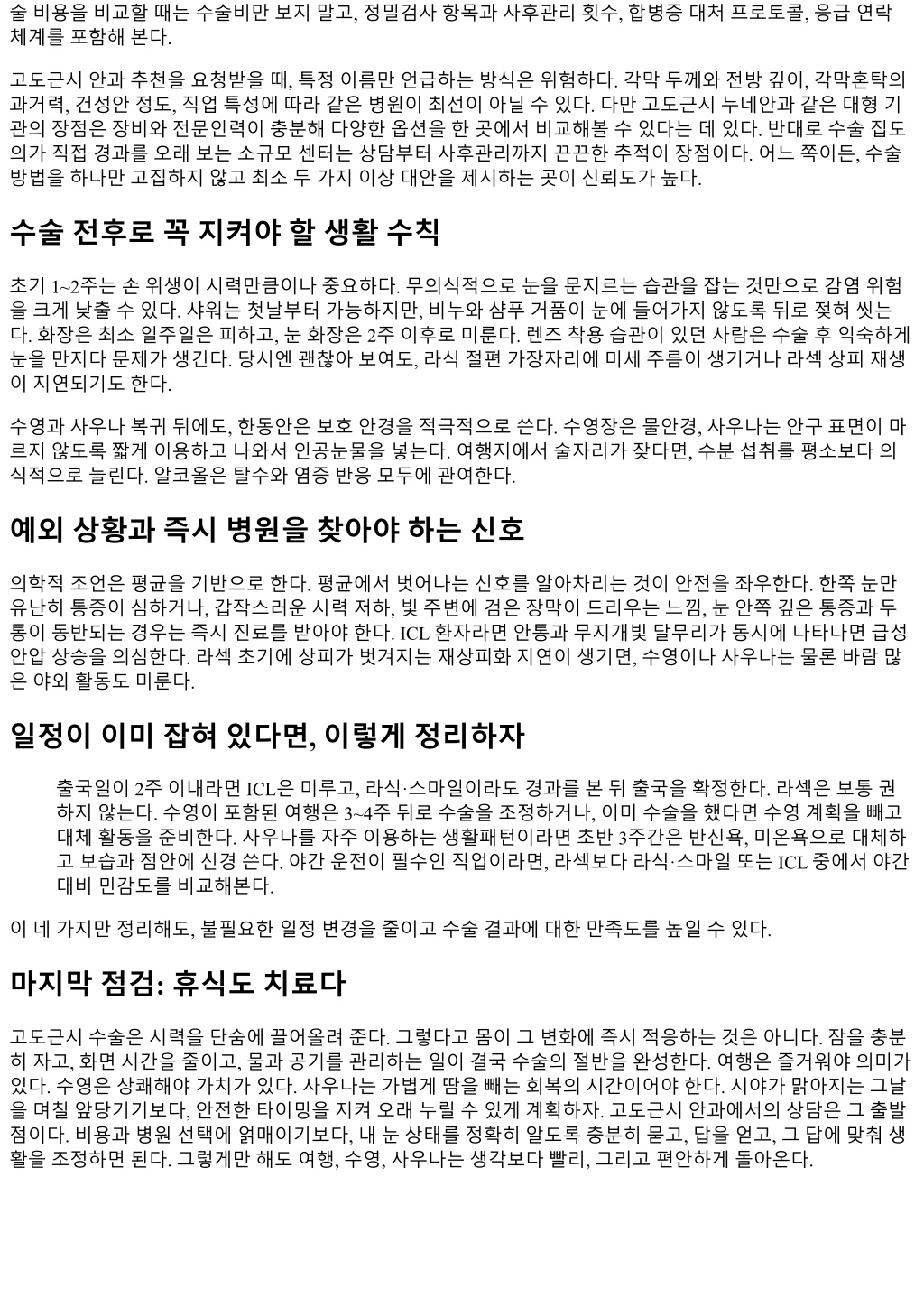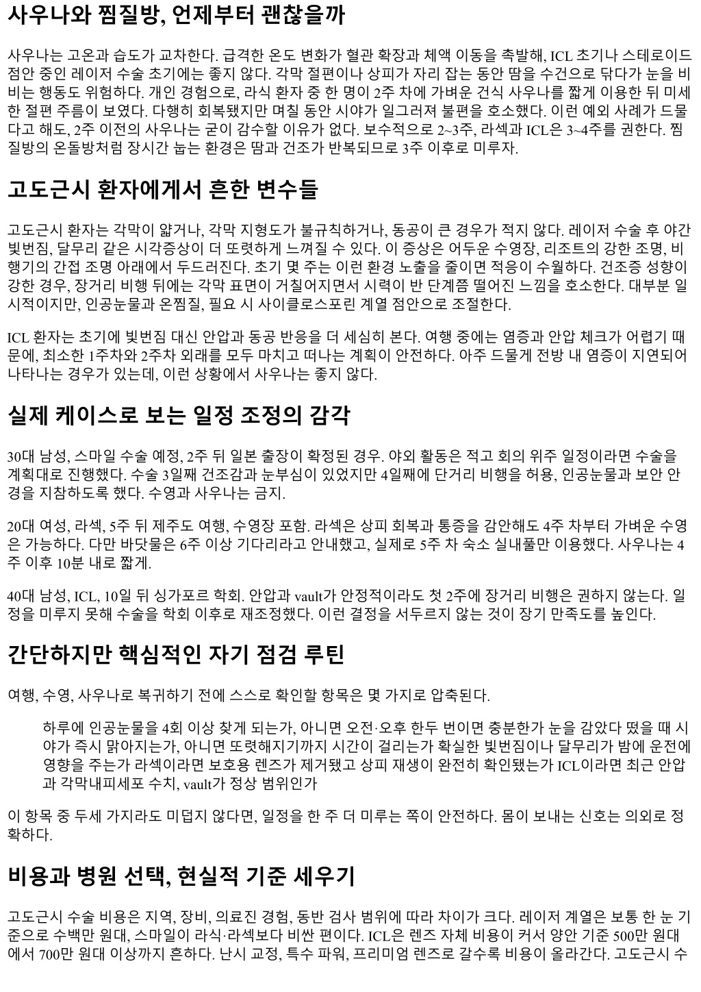사우나와찜질방, 언제부터괜찮을까 사우나는고온과습도가교차한다. 급격한온도변화가혈관확장과체액이동을촉발해, ICL 초기나스테로이드 점안중인레이저수술초기에는좋지않다. 각막절편이나상피가자리잡는동안땀을수건으로닦다가눈을비 비는행동도위험하다. 개인경험으로, 라식환자중한명이 2주차에가벼운건식사우나를짧게이용한뒤미세 한절편주름이보였다. 다행히회복됐지만며칠동안시야가일그러져불편을호소했다. 이런예외사례가드물 다고해도, 2주이전의사우나는굳이감수할이유가없다. 보수적으로 2~3주, 라섹과 ICL은 3~4주를권한다. 찜 질방의온돌방처럼장시간눕는환경은땀과건조가반복되므로 3주이후로미루자. 고도근시환자에게서흔한변수들 고도근시환자는각막이얇거나, 각막지형도가불규칙하거나, 동공이큰경우가적지않다. 레이저수술후야간 빛번짐, 달무리같은시각증상이더또렷하게느껴질수있다. 이증상은어두운수영장, 리조트의강한조명, 비 행기의간접조명아래에서두드러진다. 초기몇주는이런환경노출을줄이면적응이수월하다. 건조증성향이 강한경우, 장거리비행뒤에는각막표면이거칠어지면서시력이반단계쯤떨어진느낌을호소한다. 대부분일 시적이지만, 인공눈물과온찜질, 필요시사이클로스포린계열점안으로조절한다. ICL 환자는초기에빛번짐대신안압과동공반응을더세심히본다. 여행중에는염증과안압체크가어렵기때 문에, 최소한 1주차와 2주차외래를모두마치고떠나는계획이안전하다. 아주드물게전방내염증이지연되어 나타나는경우가있는데, 이런상황에서사우나는좋지않다. 실제케이스로보는일정조정의감각 30대남성, 스마일수술예정, 2주뒤일본출장이확정된경우. 야외활동은적고회의위주일정이라면수술을 계획대로진행했다. 수술 3일째건조감과눈부심이있었지만 4일째에단거리비행을허용, 인공눈물과보안안 경을지참하도록했다. 수영과사우나는금지. 20대여성, 라섹, 5주뒤제주도여행, 수영장포함. 라섹은상피회복과통증을감안해도 4주차부터가벼운수영 은가능하다. 다만바닷물은 6주이상기다리라고안내했고, 실제로 5주차숙소실내풀만이용했다. 사우나는 4 주이후 10분내로짧게. 40대남성, ICL, 10일뒤싱가포르학회. 안압과 vault가안정적이라도첫 2주에장거리비행은권하지않는다. 일 정을미루지못해수술을학회이후로재조정했다. 이런결정을서두르지않는것이장기만족도를높인다. 간단하지만핵심적인자기점검루틴 여행, 수영, 사우나로복귀하기전에스스로확인할항목은몇가지로압축된다. 하루에인공눈물을 4회이상찾게되는가, 아니면오전·오후한두번이면충분한가눈을감았다떴을때시 야가즉시맑아지는가, 아니면또렷해지기까지시간이걸리는가확실한빛번짐이나달무리가밤에운전에 영향을주는가라섹이라면보호용렌즈가제거됐고상피재생이완전히확인됐는가 ICL이라면최근안압 과각막내피세포수치, vault가정상범위인가 이항목중두세가지라도미덥지않다면, 일정을한주더미루는쪽이안전하다. 몸이보내는신호는의외로정 확하다. 비용과병원선택, 현실적기준세우기 고도근시수술비용은지역, 장비, 의료진경험, 동반검사범위에따라차이가크다. 레이저계열은보통한눈기 준으로수백만원대, 스마일이라식·라섹보다비싼편이다. ICL은렌즈자체비용이커서양안기준 500만원대 에서 700만원대이상까지흔하다. 난시교정, 특수파워, 프리미엄렌즈로갈수록비용이올라간다. 고도근시수