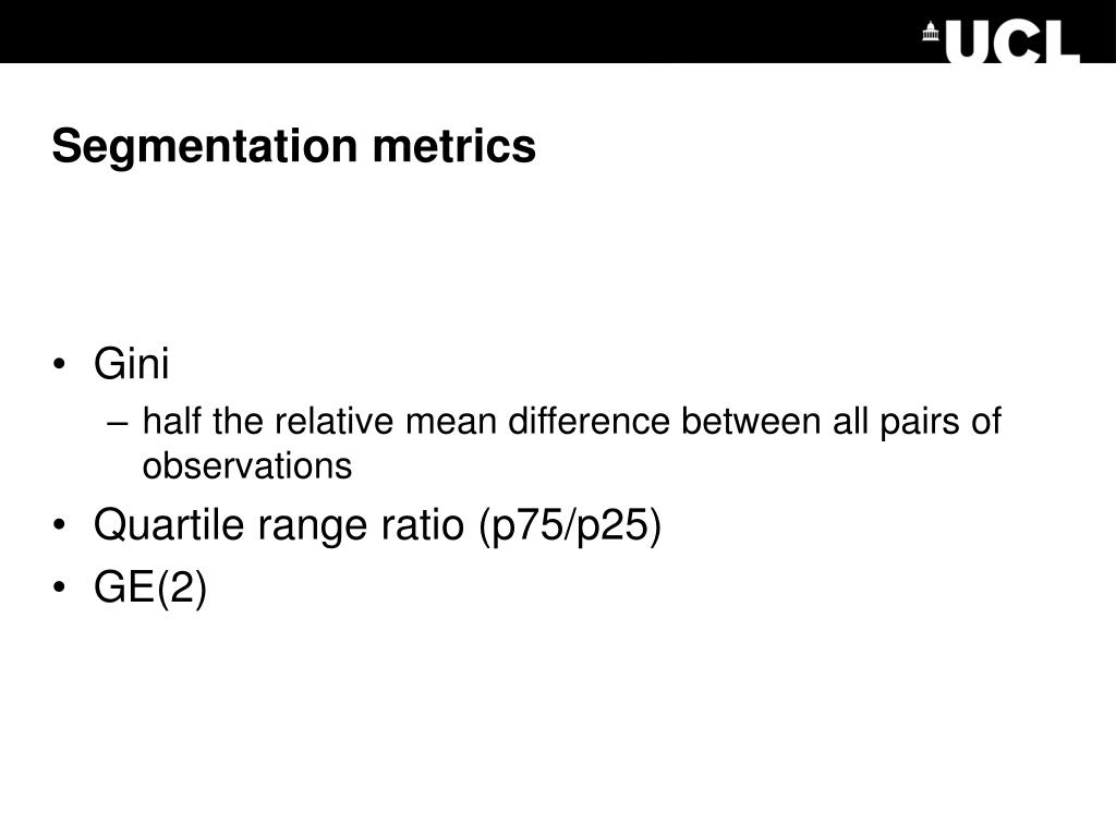 Segmentation metrics • Gini • half the relative mean difference between all pairs of observations • Quartile range ratio (p75/p25) • GE(2)