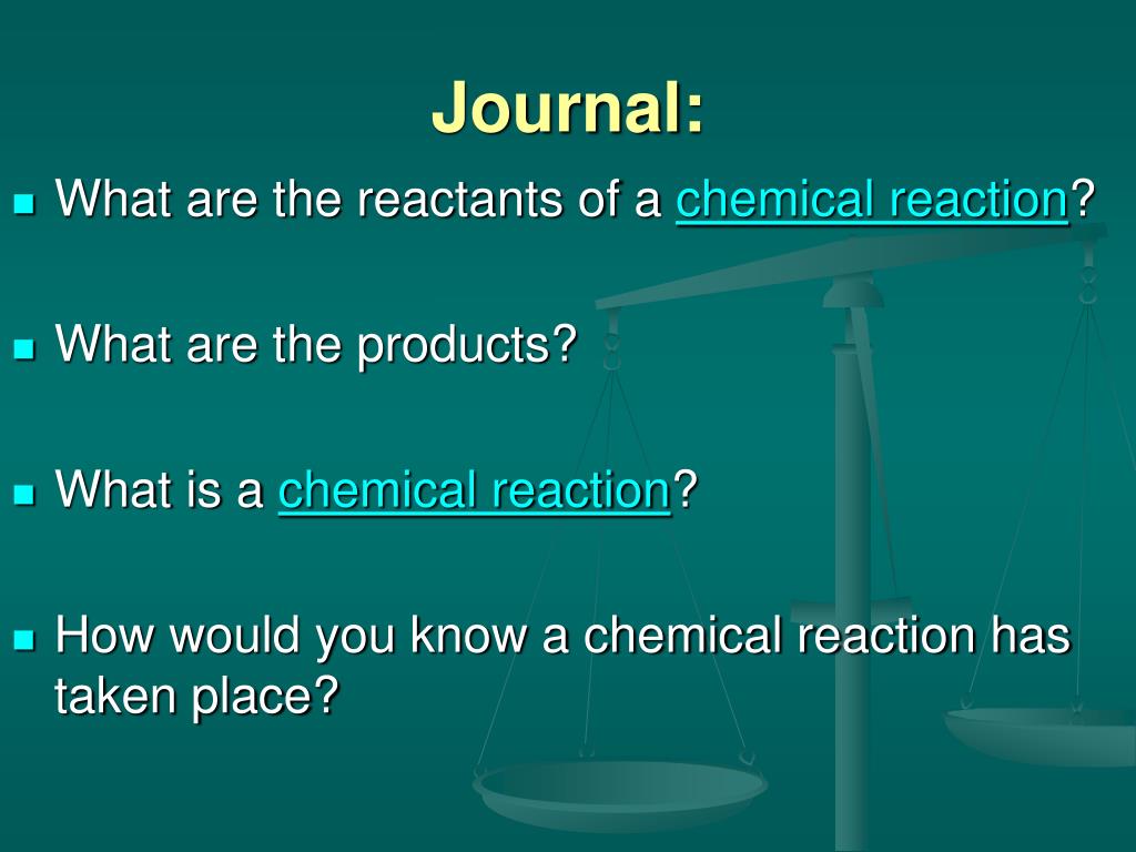Journal: • What are the reactants of a chemical reaction? • What are the products? • What is a chemical reaction? • How would you know a chemical reaction has taken place?