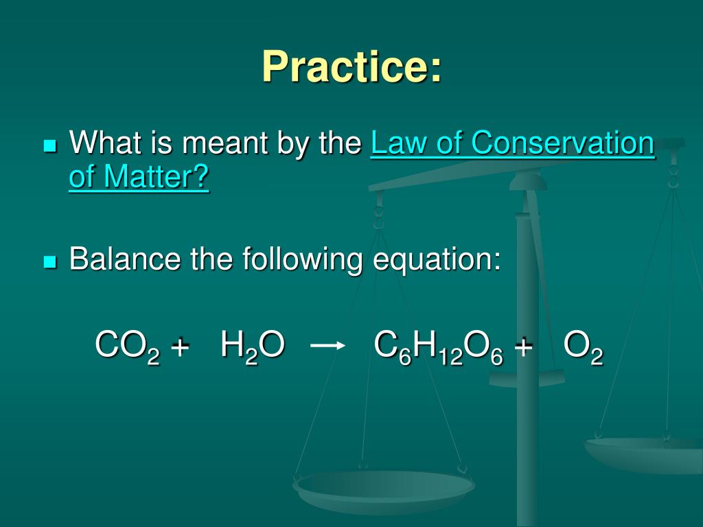 Practice: • What is meant by the Law of Conservation of Matter? • Balance the following equation: CO2 + H2O C6H12O6 + O2
