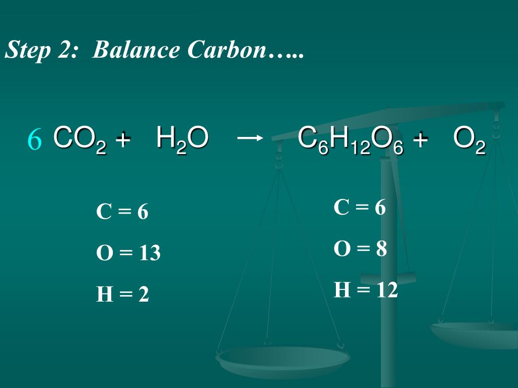 Step 2: Balance Carbon….. 6 CO2 + H2O C6H12O6 + O2 C = 6 O = 8 H = 12 C = 6 O = 13 H = 2