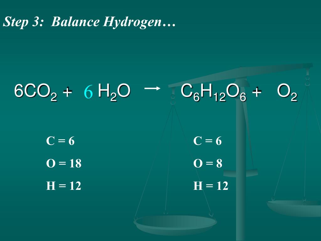 Step 3: Balance Hydrogen… 6CO2 + H2O C6H12O6 + O2 6 C = 6 O = 18 H = 12 C = 6 O = 8 H = 12