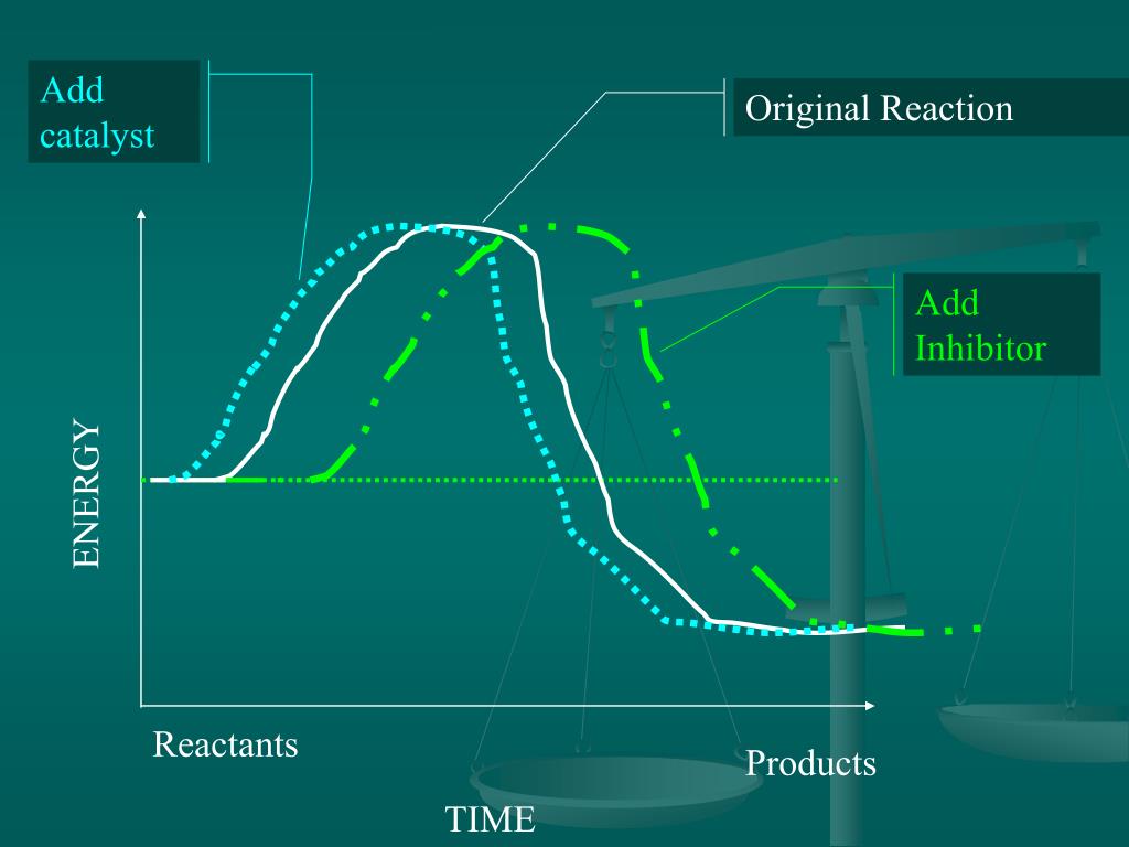 Add catalyst Original Reaction Add Inhibitor ENERGY Reactants Products TIME