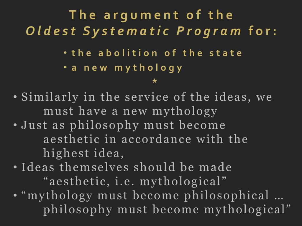 The argument of theOldest Systematic Program for: • the abolition of the state • a new mythology • * • Similarly in the service of the ideas, we must have a new mythology • Just as philosophy must become aesthetic in accordance with the highest idea, • Ideas themselves should be made “aesthetic, i.e. mythological” • “mythology must become philosophical … philosophy must become mythological”