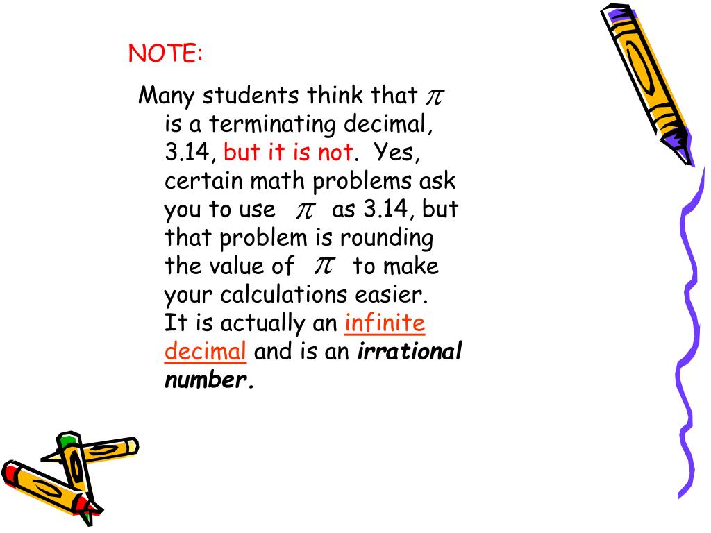 NOTE: Many students think that is a terminating decimal, 3.14, but it is not. Yes, certain math problems ask you to use as 3.14, but that problem is rounding the value of to make your calculations easier. It is actually an infinitedecimal and is an irrational number.