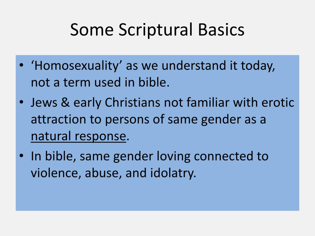 Some Scriptural Basics • ‘Homosexuality’ as we understand it today, not a term used in bible. • Jews & early Christians not familiar with erotic attraction to persons of same gender as a natural response. • In bible, same gender loving connected to violence, abuse, and idolatry.