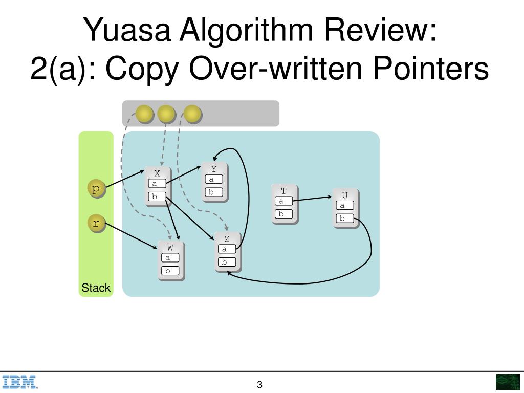 r U Y T X W Z a a a a a a b b b b b b Yuasa Algorithm Review:2(a): Copy Over-written Pointers Stack p