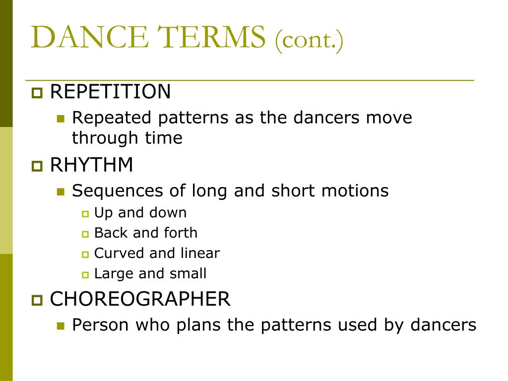 DANCE TERMS (cont.) • REPETITION • Repeated patterns as the dancers move through time • RHYTHM • Sequences of long and short motions • Up and down • Back and forth • Curved and linear • Large and small • CHOREOGRAPHER • Person who plans the patterns used by dancers