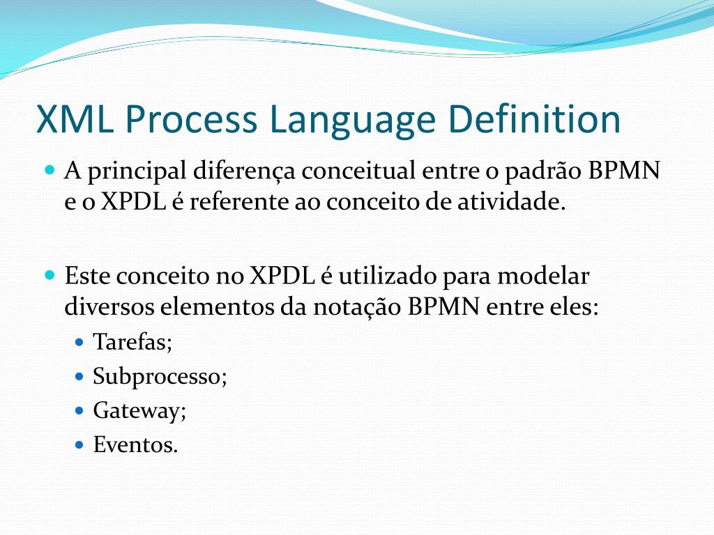 XML ProcessLanguageDefinition • A principal diferença conceitual entre o padrão BPMN e o XPDL é referente ao conceito de atividade. • Este conceito no XPDL é utilizado para modelar diversos elementos da notação BPMN entre eles: • Tarefas; • Subprocesso; • Gateway; • Eventos.
