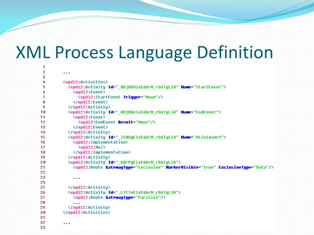 XML ProcessLanguageDefinition • Para os criadores do XPDL, o BPMN é o padrão ideal para modelar o processo em nível visual e o XPDL para definir suas regras em nível técnico. • Os elementos da notação BPMN podem ser encontradas na sintaxe do XPDL sendo que para cada elemento existe um código apropriado.