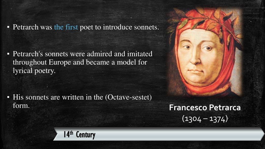 Petrarchwas the first poet to introduce sonnets. • Petrarch's sonnets were admired and imitated throughout Europe and became a model for lyrical poetry. • His sonnets are written in the (Octave-sestet) form. Francesco Petrarca (1304 – 1374) 14th Century