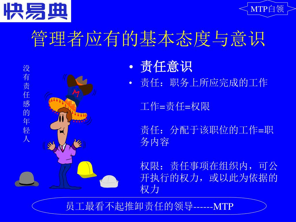 MTP白领 管理者应有的基本态度与意识 没有责任感的年轻人 • 责任意识 • 责任:职务上所应完成的工作工作=责任=权限责任:分配于该职位的工作=职务内容权限:责任事项在组织内,可公开执行的权力,或以此为依据的权力 员工最看不起推卸责任的领导------MTP