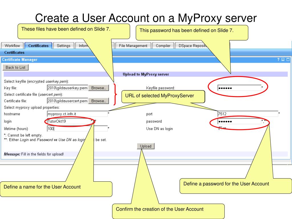 Create a User Account on a MyProxy server These files have been defined on Slide 7. This password has been defined on Slide 7. URL of selected MyProxyServer URL of selected MyProxyServer Define a password for the User Account Define a name for the User Account Confirm the creation of the User Account