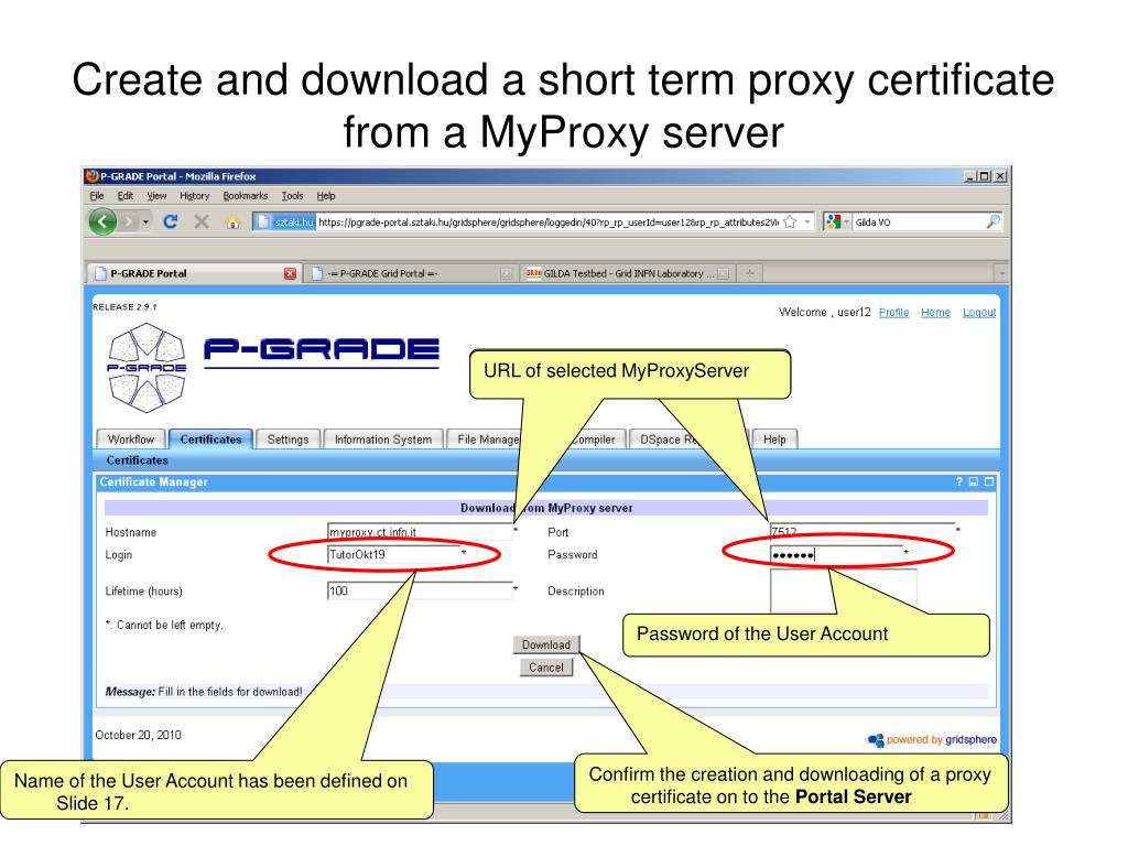 Create and download a short term proxy certificate from a MyProxy server URL of selected MyProxyServer URL of selected MyProxyServer Password of the User Account Confirm the creation and downloading of a proxy certificate on to the Portal Server Name of the User Account has been defined on Slide 17.