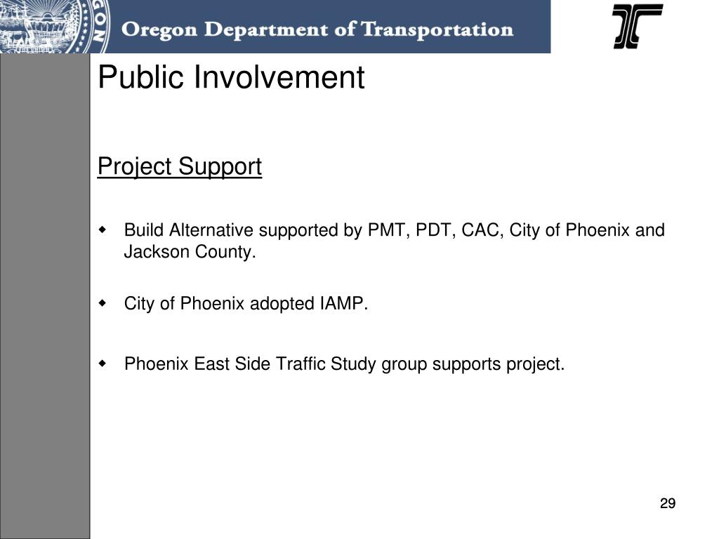 Public Involvement Project Support • Build Alternative supported by PMT, PDT, CAC, City of Phoenix and Jackson County. • City of Phoenix adopted IAMP. • Phoenix East Side Traffic Study group supports project. 29