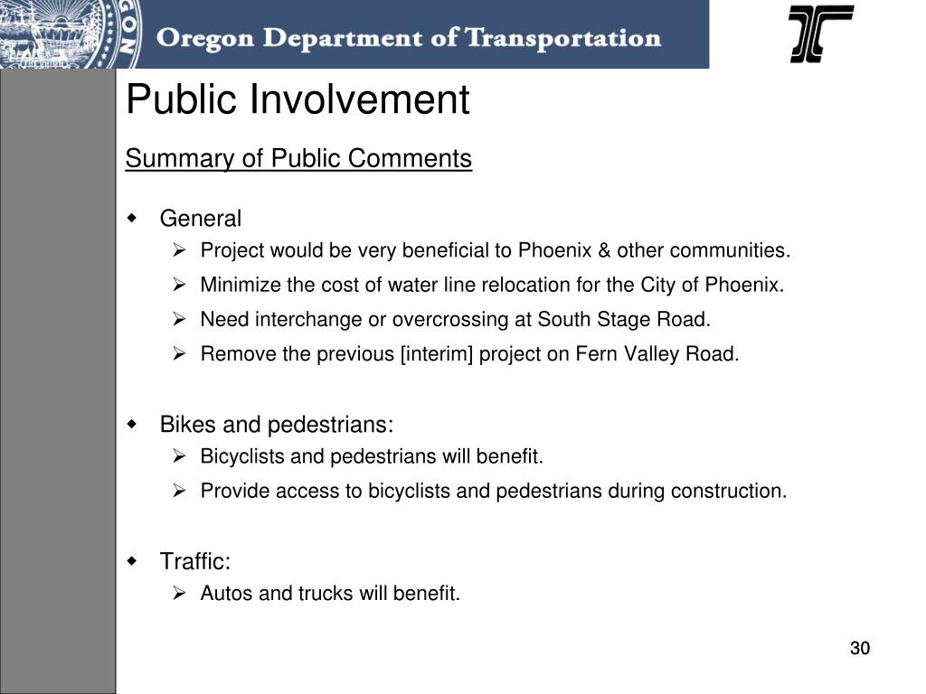 Summary of Public Comments General Project would be very beneficial to Phoenix & other communities. Minimize the cost of water line relocation for the City of Phoenix. Need interchange or overcrossing at South Stage Road. Remove the previous [interim] project on Fern Valley Road. Bikes and pedestrians: Bicyclists and pedestrians will benefit. Provide access to bicyclists and pedestrians during construction. Traffic: Autos and trucks will benefit. Public Involvement 30