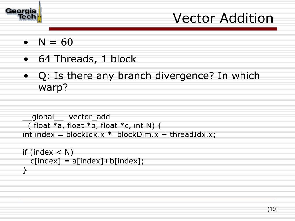 Vector Addition • N = 60 • 64 Threads, 1 block • Q: Is there any branch divergence? In which warp? __global__ vector_add ( float *a, float *b, float *c, int N) { int index = blockIdx.x * blockDim.x + threadIdx.x; if (index < N) c[index] = a[index]+b[index]; }