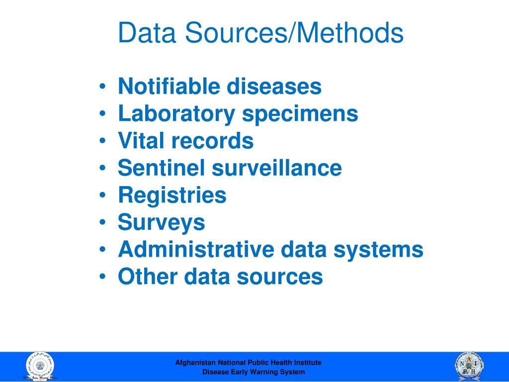 Data Sources/Methods • Notifiable diseases • Laboratory specimens • Vital records • Sentinel surveillance • Registries • Surveys • Administrative data systems • Other data sources