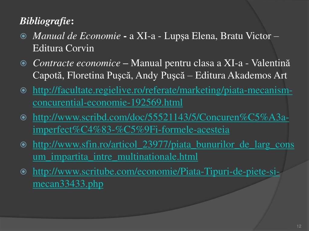 Bibliografie: • Manual de Economie- a XI-a - Lupşa Elena, Bratu Victor – EdituraCorvin • Contracteeconomice– Manual pentruclasa a XI-a - ValentinăCapotă, FloretinaPuşcă, Andy Puşcă – EdituraAkademos Art • http://facultate.regielive.ro/referate/marketing/piata-mecanism-concurential-economie-192569.html • http://www.scribd.com/doc/55521143/5/Concuren%C5%A3a-imperfect%C4%83-%C5%9Fi-formele-acesteia • http://www.sfin.ro/articol_23977/piata_bunurilor_de_larg_consum_impartita_intre_multinationale.html • http://www.scritube.com/economie/Piata-Tipuri-de-piete-si-mecan33433.php