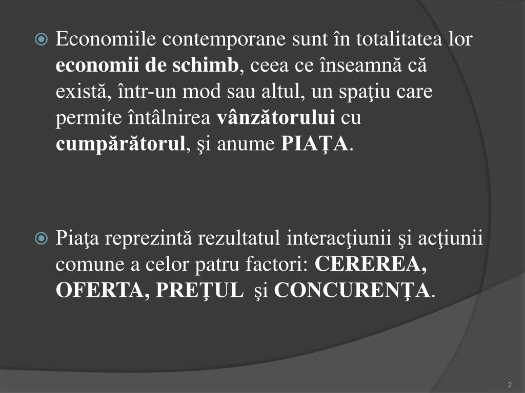 Economiile contemporane sunt în totalitatea lor economii de schimb, ceea ce înseamnă că există, într-un mod sau altul, un spaţiu care permite întâlnirea vânzătorului cu cumpărătorul, şi anume PIAŢA. • Piaţa reprezintă rezultatul interacţiunii şi acţiunii comune a celor patru factori: CEREREA,OFERTA,PREŢUL şi CONCURENŢA.