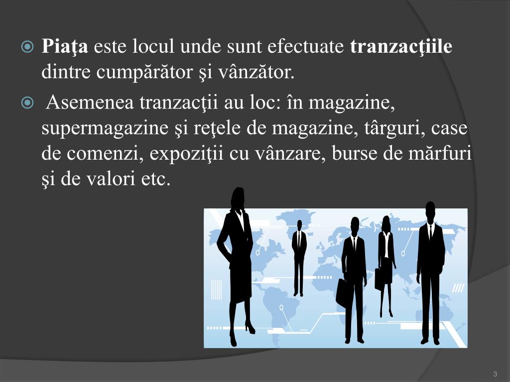 Piaţa este locul unde sunt efectuate tranzacţiile dintre cumpărător şi vânzător. • Asemenea tranzacţii au loc: în magazine, supermagazine şi reţele de magazine, târguri, case de comenzi, expoziţii cu vânzare, burse de mărfuri şi de valori etc.