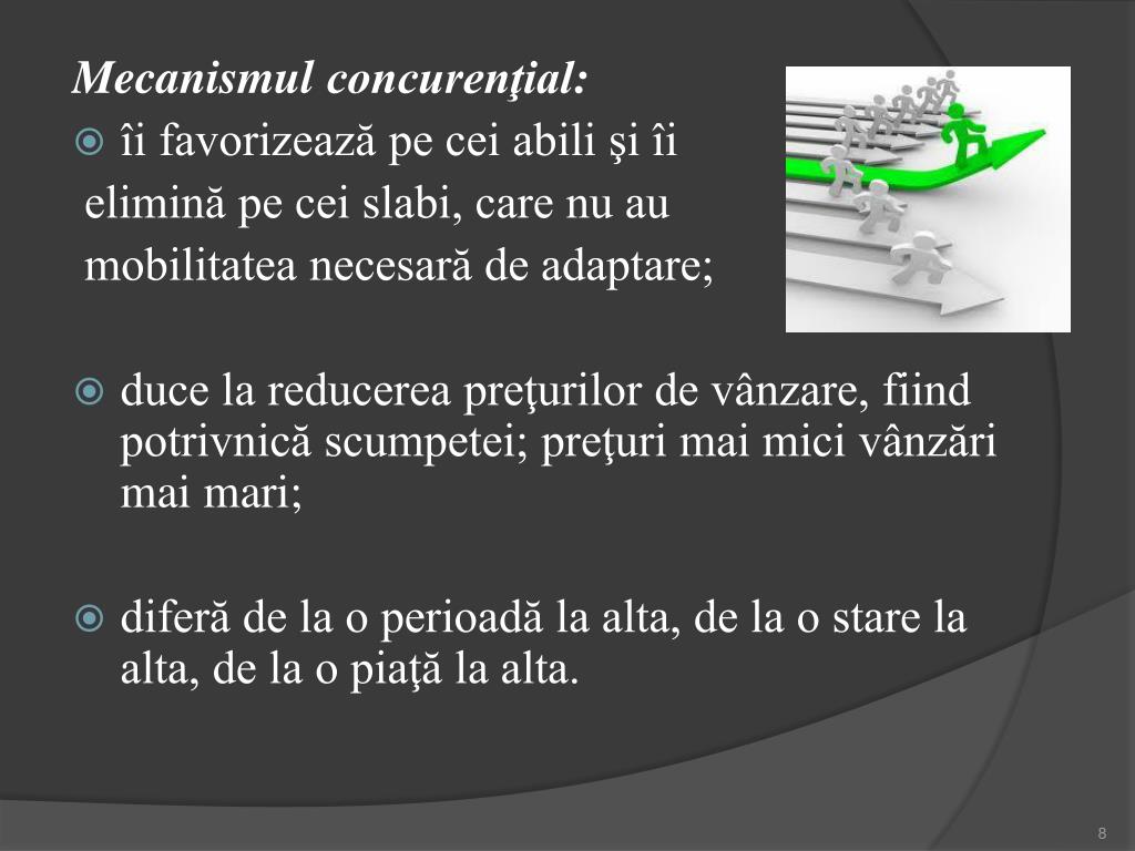 Mecanismul concurenţial: • îi favorizează pe cei abili şi îi elimină pe cei slabi, care nu au mobilitatea necesară de adaptare; • duce la reducerea preţurilor de vânzare, fiind potrivnică scumpetei; preţuri mai mici vânzări mai mari; • diferă de la o perioadă la alta, de la o stare la alta, de la o piaţă la alta.
