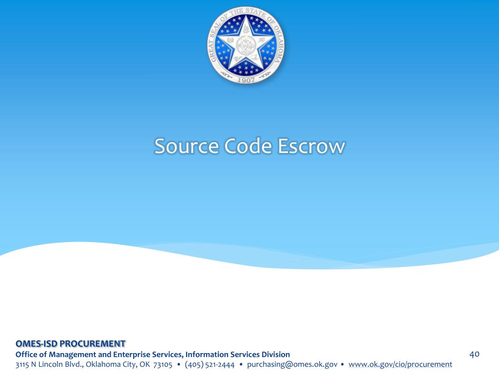 Source Code Escrow (Title 62.OS) Why? • Should the software provider cease to support the software, it becomes the property of the purchasers. It is the responsibility of the purchaser to arrange for continued maintenance of the product. • Neutral third parties, the Source Code Escrow agents, serve both the end-user and the software supplier by providing physical and legal protection for the escrow deposits and all related services. OMES-ISD PROCUREMENT Office of Management and Enterprise Services, Information Services Division 3115 N Lincoln Blvd., Oklahoma City, OK 73105 • (405) 521-2444 • purchasing@omes.ok.gov • www.ok.gov/cio/procurement