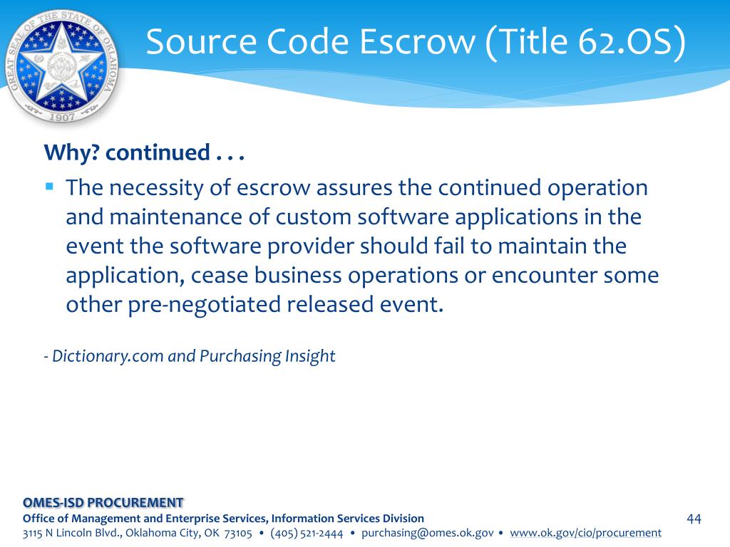 Source Code Escrow (Title 62.OS) Why? continued . . . • The necessity of escrow assures the continued operation and maintenance of custom software applications in the event the software provider should fail to maintain the application, cease business operations or encounter some other pre-negotiated released event. - Dictionary.com and Purchasing Insight OMES-ISD PROCUREMENT Office of Management and Enterprise Services, Information Services Division 3115 N Lincoln Blvd., Oklahoma City, OK 73105 • (405) 521-2444 • purchasing@omes.ok.gov • www.ok.gov/cio/procurement