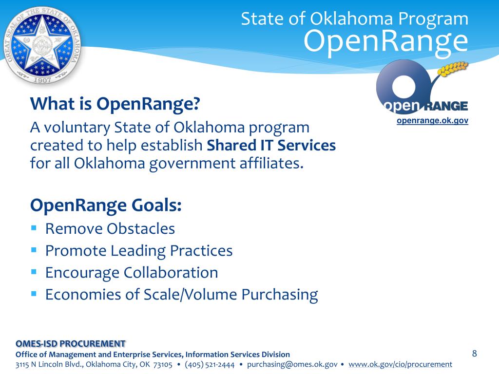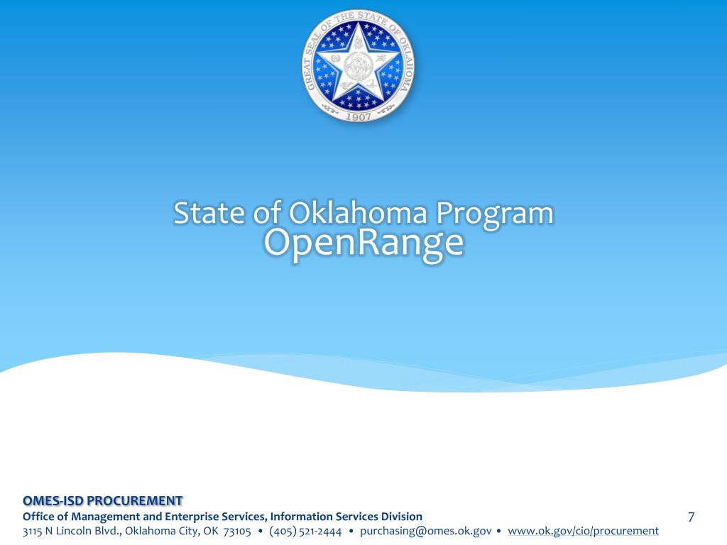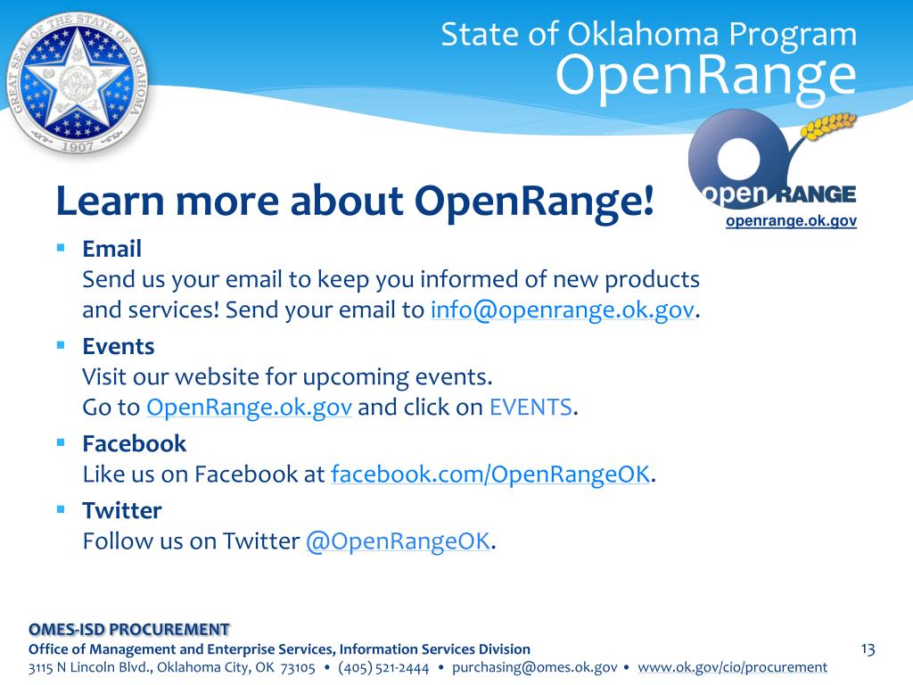 State of Oklahoma ProgramOpenRange Learn more about OpenRange! • EmailSend us your email to keep you informed of new productsand services! Send your email to info@openrange.ok.gov. • EventsVisit our website for upcoming events.Go to OpenRange.ok.govand click on EVENTS. • FacebookLike us on Facebook at facebook.com/OpenRangeOK. • TwitterFollow us on Twitter @OpenRangeOK. openrange.ok.gov OMES-ISD PROCUREMENT Office of Management and Enterprise Services, Information Services Division 3115 N Lincoln Blvd., Oklahoma City, OK 73105 • (405) 521-2444 • purchasing@omes.ok.gov • www.ok.gov/cio/procurement