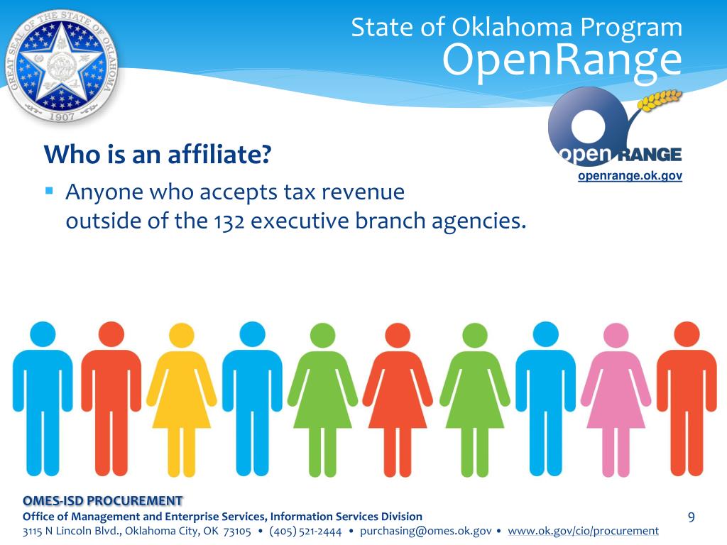 State of Oklahoma ProgramOpenRange Who is an affiliate? • Anyone who accepts tax revenueoutside of the 132 executive branch agencies. openrange.ok.gov OMES-ISD PROCUREMENT Office of Management and Enterprise Services, Information Services Division 3115 N Lincoln Blvd., Oklahoma City, OK 73105 • (405) 521-2444 • purchasing@omes.ok.gov • www.ok.gov/cio/procurement