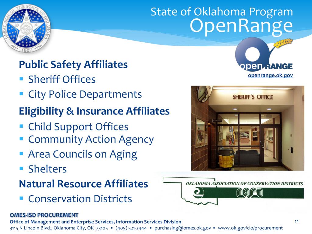 State of Oklahoma ProgramOpenRange Public Safety Affiliates • Sheriff Offices • City Police Departments Eligibility & Insurance Affiliates • Child Support Offices • Community Action Agency • Area Councils on Aging • Shelters Natural Resource Affiliates • Conservation Districts openrange.ok.gov OMES-ISD PROCUREMENT Office of Management and Enterprise Services, Information Services Division 3115 N Lincoln Blvd., Oklahoma City, OK 73105 • (405) 521-2444 • purchasing@omes.ok.gov • www.ok.gov/cio/procurement