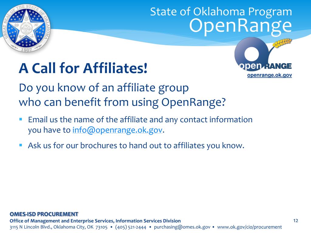 State of Oklahoma ProgramOpenRange A Call for Affiliates! Do you know of an affiliate groupwho can benefit from using OpenRange? • Email us the name of the affiliate and any contact informationyou have to info@openrange.ok.gov. • Ask us for our brochures to hand out to affiliates you know. openrange.ok.gov OMES-ISD PROCUREMENT Office of Management and Enterprise Services, Information Services Division 3115 N Lincoln Blvd., Oklahoma City, OK 73105 • (405) 521-2444 • purchasing@omes.ok.gov • www.ok.gov/cio/procurement