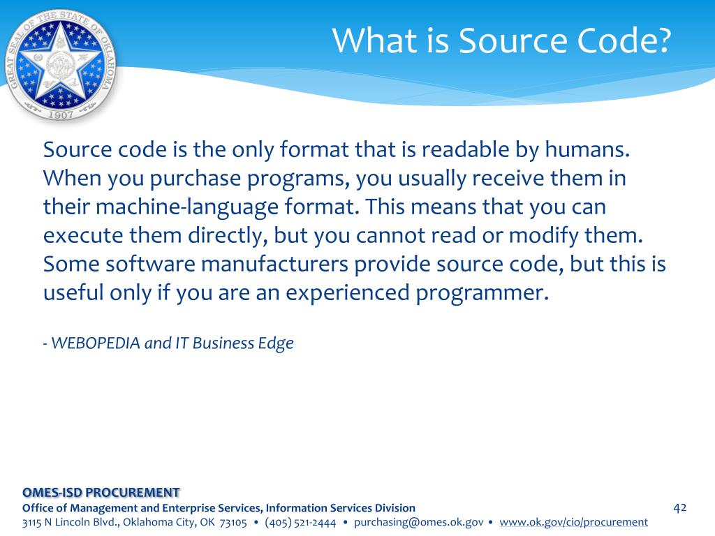 What is Source Code? Source code is the only format that is readable by humans. When you purchase programs, you usually receive them in their machine-language format. This means that you can execute them directly, but you cannot read or modify them. Some software manufacturers provide source code, but this is useful only if you are an experienced programmer. - WEBOPEDIAand IT Business Edge OMES-ISD PROCUREMENT Office of Management and Enterprise Services, Information Services Division 3115 N Lincoln Blvd., Oklahoma City, OK 73105 • (405) 521-2444 • purchasing@omes.ok.gov • www.ok.gov/cio/procurement