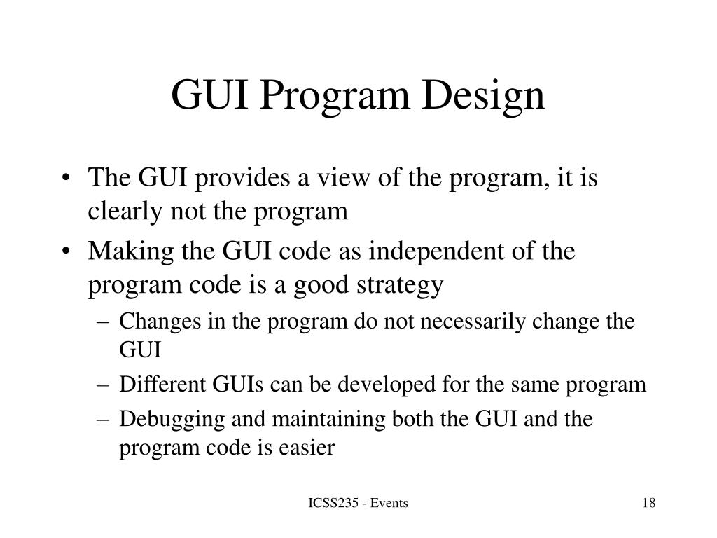 GUI Program Design • The GUI provides a view of the program, it is clearly not the program • Making the GUI code as independent of the program code is a good strategy • Changes in the program do not necessarily change the GUI • Different GUIs can be developed for the same program • Debugging and maintaining both the GUI and the program code is easier ICSS235 - Events