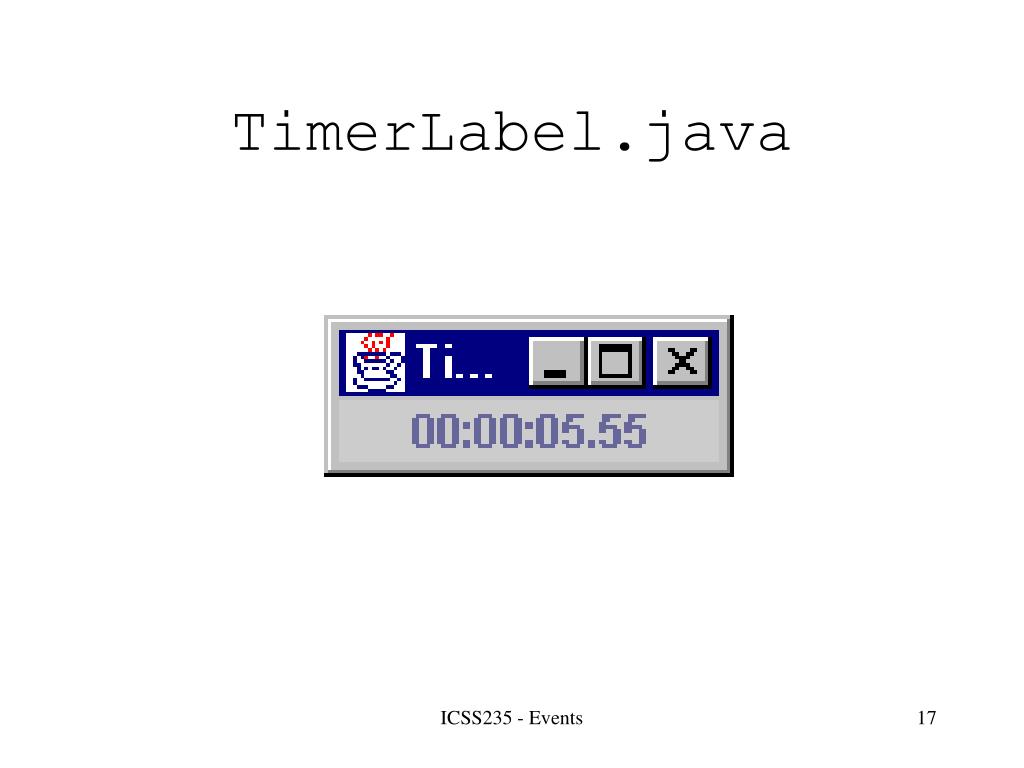 Example import javax.swing.*; import java.awt.*; import java.awt.event.*; public class SwingFrame implements ActionListener { private JFrame win; public SwingFrame( String title ) { win = new JFrame( title ); win.addWindowListener( new WindowAdapter() { public void windowClosing( WindowEvent e ) { System.exit ( 0 ); } } ); win.getContentPane().setLayout( new FlowLayout() ); ICSS235 - Events