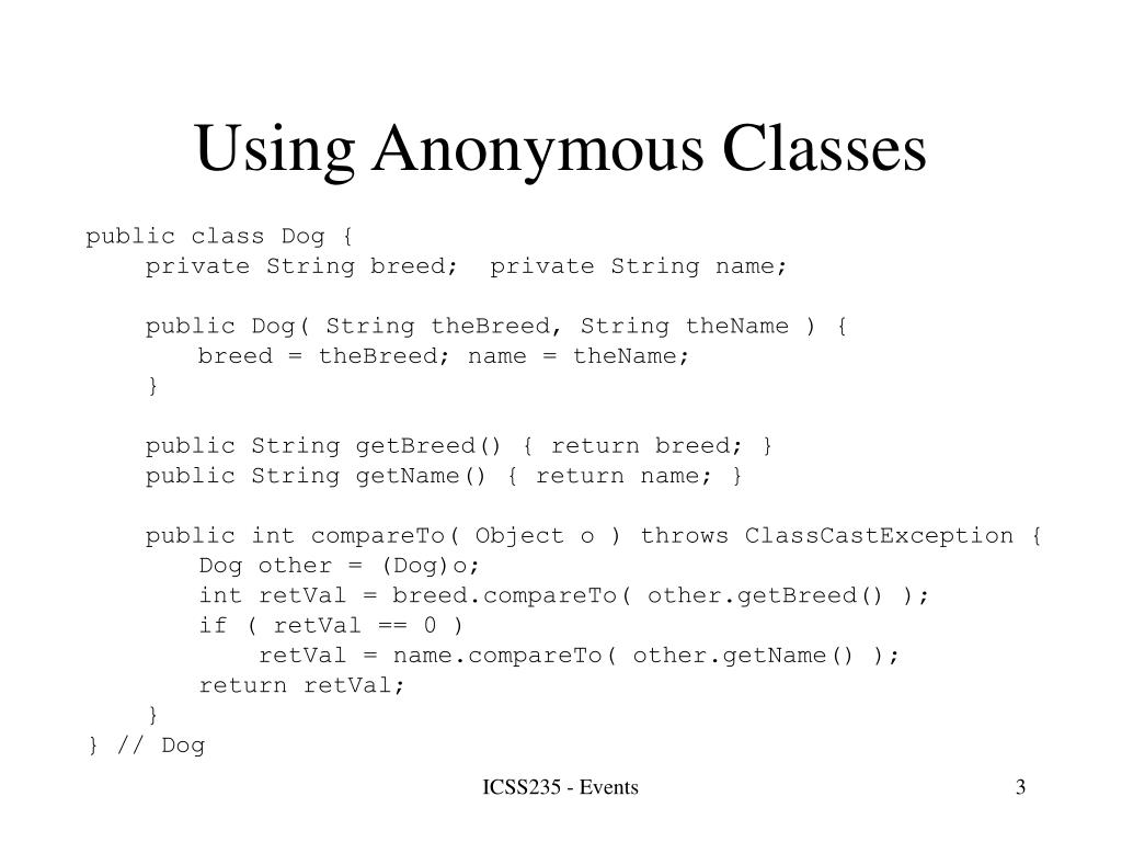 Using Anonymous Classes public class Dog { private String breed; private String name; public Dog( String theBreed, String theName ) { breed = theBreed; name = theName; } public String getBreed() { return breed; } public String getName() { return name; } public int compareTo( Object o ) throws ClassCastException { Dog other = (Dog)o; int retVal = breed.compareTo( other.getBreed() ); if ( retVal == 0 ) retVal = name.compareTo( other.getName() ); return retVal; } } // Dog ICSS235 - Events