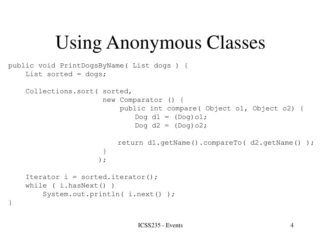 Using Anonymous Classes public void PrintDogsByName( List dogs ) { List sorted = dogs; Collections.sort( sorted, new Comparator () { public int compare( Object o1, Object o2) { Dog d1 = (Dog)o1; Dog d2 = (Dog)o2; return d1.getName().compareTo( d2.getName() ); } ); Iterator i = sorted.iterator(); while ( i.hasNext() ) System.out.println( i.next() ); } ICSS235 - Events