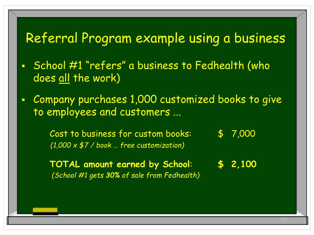 Referral Program example using a business • School #1 “refers” a business to Fedhealth (who does all the work) • Company purchases 1,000 customized books to give to employees and customers ... Cost to business for custom books: $ 7,000 (1,000 x $7 / book … free customization) TOTAL amount earned by School: $ 2,100 (School #1 gets 30% of sale from Fedhealth)