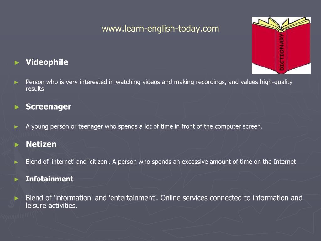 www.learn-english-today.com Videophile Person who is very interested in watching videos and making recordings, and values high-quality results Screenager A young person or teenager who spends a lot of time in front of the computer screen. Netizen Blend of 'internet' and 'citizen'. A person who spends an excessive amount of time on the Internet Infotainment Blend of 'information' and 'entertainment'. Online services connected to information and leisure activities.