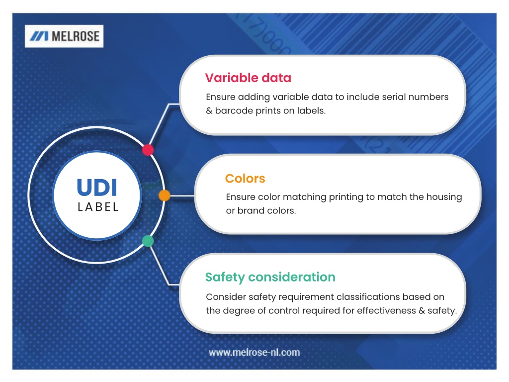 Variable data Ensure adding variable data to include serial numbers & barcode prints on labels. UDI LABEL Colors Ensure color matching printing to match the housing or brand colors. Safety consideration Consider safety requirement classifications based on the degree of control required for effectiveness & safety.