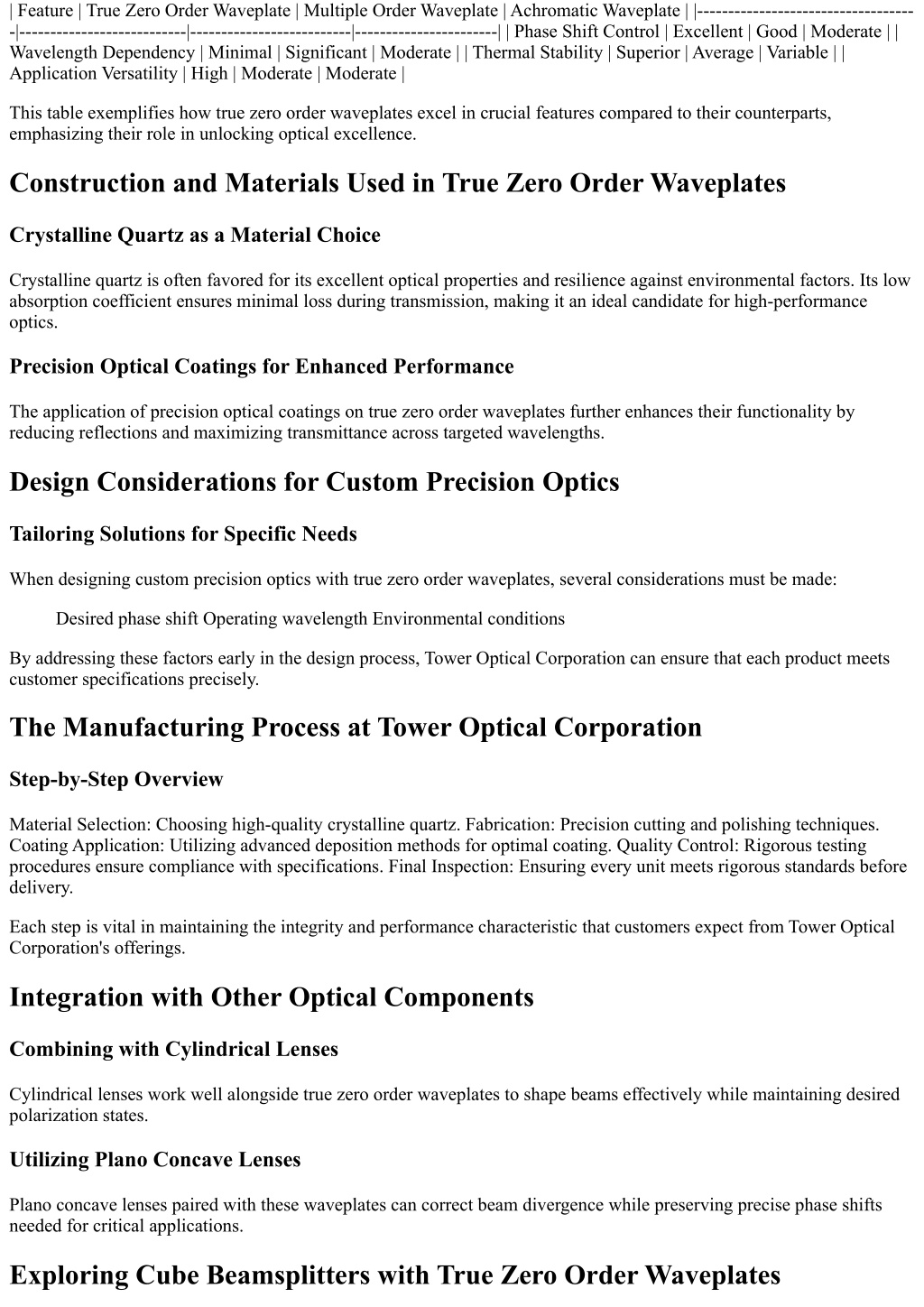 | Feature | True Zero Order Waveplate | Multiple Order Waveplate | Achromatic Waveplate | |----------------------------------- -|---------------------------|--------------------------|-----------------------| | Phase Shift Control | Excellent | Good | Moderate | | Wavelength Dependency | Minimal | Significant | Moderate | | Thermal Stability | Superior | Average | Variable | | Application Versatility | High | Moderate | Moderate | This table exemplifies how true zero order waveplates excel in crucial features compared to their counterparts, emphasizing their role in unlocking optical excellence. Construction and Materials Used in True Zero Order Waveplates Crystalline Quartz as a Material Choice Crystalline quartz is often favored for its excellent optical properties and resilience against environmental factors. Its low absorption coefficient ensures minimal loss during transmission, making it an ideal candidate for high-performance optics. Precision Optical Coatings for Enhanced Performance The application of precision optical coatings on true zero order waveplates further enhances their functionality by reducing reflections and maximizing transmittance across targeted wavelengths. Design Considerations for Custom Precision Optics Tailoring Solutions for Specific Needs When designing custom precision optics with true zero order waveplates, several considerations must be made: Desired phase shift Operating wavelength Environmental conditions By addressing these factors early in the design process, Tower Optical Corporation can ensure that each product meets customer specifications precisely. The Manufacturing Process at Tower Optical Corporation Step-by-Step Overview Material Selection: Choosing high-quality crystalline quartz. Fabrication: Precision cutting and polishing techniques. Coating Application: Utilizing advanced deposition methods for optimal coating. Quality Control: Rigorous testing procedures ensure compliance with specifications. Final Inspection: Ensuring every unit meets rigorous standards before delivery. Each step is vital in maintaining the integrity and performance characteristic that customers expect from Tower Optical Corporation's offerings. Integration with Other Optical Components Combining with Cylindrical Lenses Cylindrical lenses work well alongside true zero order waveplates to shape beams effectively while maintaining desired polarization states. Utilizing Plano Concave Lenses Plano concave lenses paired with these waveplates can correct beam divergence while preserving precise phase shifts needed for critical applications. Exploring Cube Beamsplitters with True Zero Order Waveplates