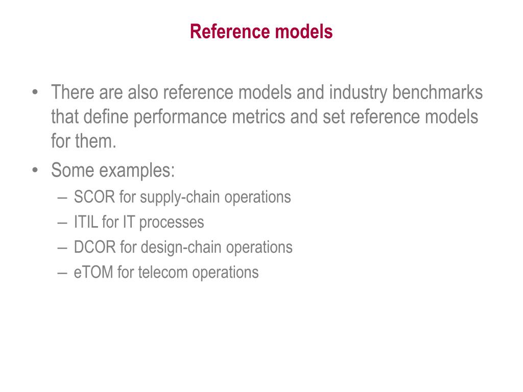 Reference models • There are also reference models and industry benchmarks that define performance metrics and set reference models for them. • Some examples: • SCOR for supply-chain operations • ITIL for IT processes • DCOR for design-chain operations • eTOM for telecom operations